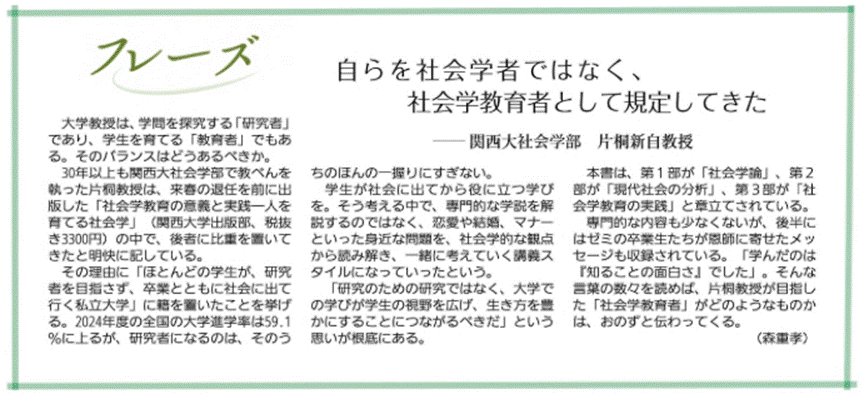 43年に及ぶ社会学教師としての集大成としてまとめた新刊書『社会学教育の意義と実践――人を育てる社会学――』(関西大学出版部、縦書423頁、税込3630円)が発売されました。はじめの20頁ほどを読むことのできる関西大学出版部のリンクを示しておきます。社会学に関心のある方なら、興味深く読んでもらえると思います。(2025.9.15)